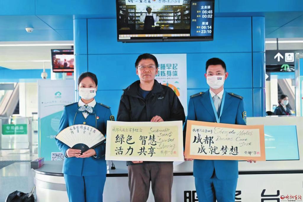 成都大運會期間一爾(中)的書法作品被地鐵志愿者服務站收藏