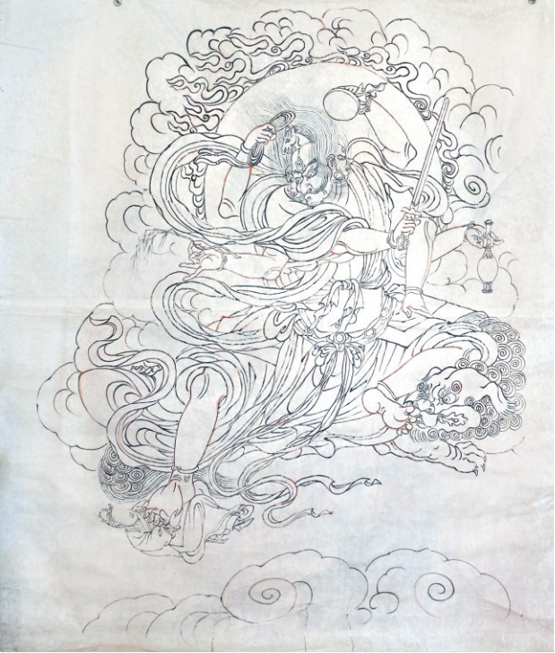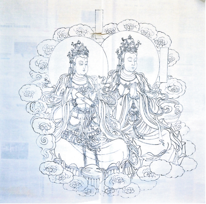 在李向東看來,臨寫是為了學(xué)習(xí)而不是“復(fù)制”壁畫。面對殘破或年久漫漶不清的畫面,他從蛛絲馬跡入手反復(fù)揣摩,根據(jù)壁畫整體的線描、造型特點,一一補而畫之,最后定稿。從這個意義上說,李向東也使殘破的公主寺壁畫得以復(fù)原,“補壁”之功不可小覷。