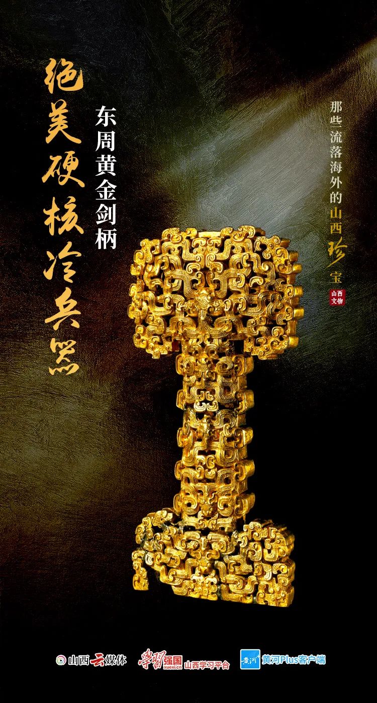 這把黃金劍柄,制作于公元前6至5世紀,長度9.8厘米,為鏤空雕刻蟠虺紋,做工精細,華麗異常。 從公元前 8 世紀開始,黃金開始進入中國,當時更多的是用以制作飾品,金器和金戒指常出現于西周晚期的墓葬中。這件文物據說是晚清時出土于山西省渾源縣李家峪村東周時期的墓葬群,后進獻給皇家收藏于北京圓明園,清末流失海外。 該藏品是1937年大英博物館從私人收藏家尤莫霍普羅斯處收購所得。