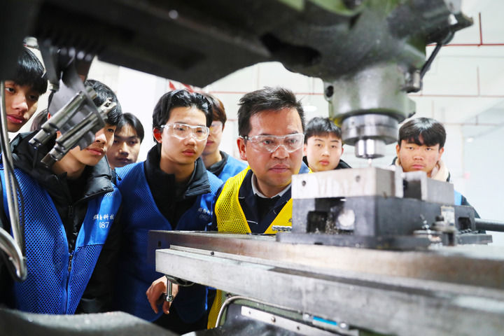 2024年1月9日,在湖南省永州市新田縣產(chǎn)業(yè)開(kāi)發(fā)區(qū)永州群翰科技有限公司車(chē)間,新田縣職業(yè)中等專業(yè)學(xué)校學(xué)生在工廠師傅的指導(dǎo)下學(xué)習(xí)機(jī)床操作技術(shù)。近年來(lái),該校聯(lián)合企業(yè)開(kāi)展“產(chǎn)教融合、校企辦學(xué)”模式,助推就業(yè)創(chuàng)業(yè)。新華社發(fā)(劉貴雄 攝)