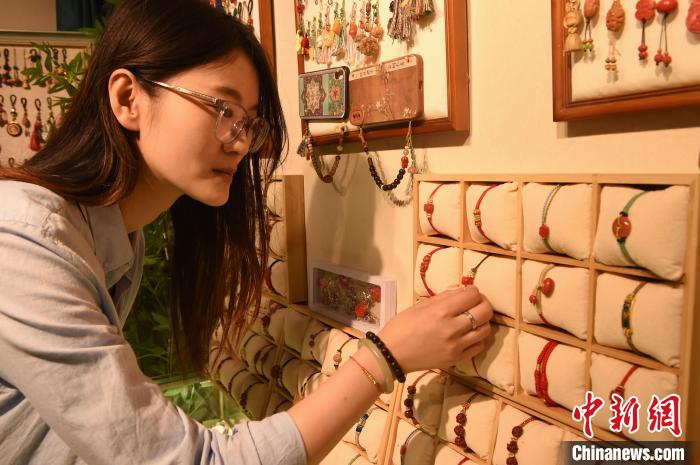 在這家首飾原創(chuàng)店,3名編織師傅忙著將型珠、掛片等用彩線串聯(lián)編結(jié)成手繩。不少顧客從家中帶來金玉飾品,根據(jù)自己的生肖、個性等,選擇配線和繩結(jié)樣式,定制專屬腕飾。