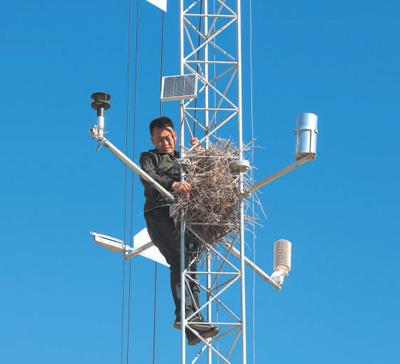 沙林中心科研人員對沙塵觀測塔進行維護。