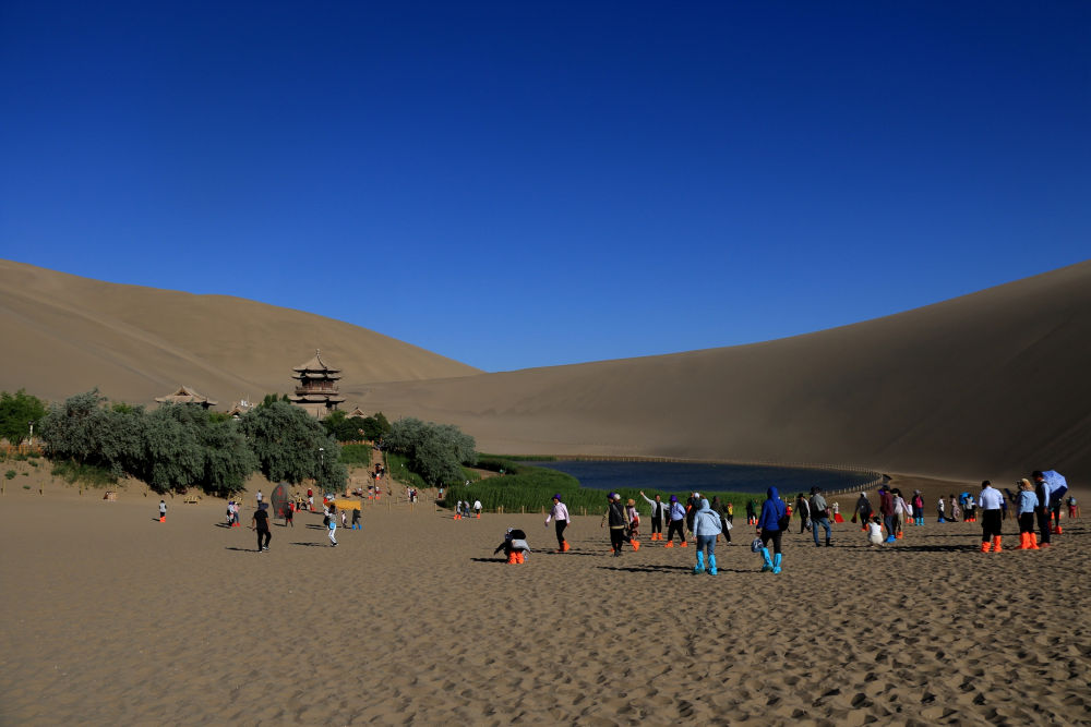從敦煌市區(qū)出發(fā),向南行走5公里,就到了鳴沙山下。起伏黃沙勾勒出一道道利落的曲線,三面沙山環(huán)抱,突現(xiàn)一泓月牙形狀的清泉,水波蕩漾,魚翔淺底。