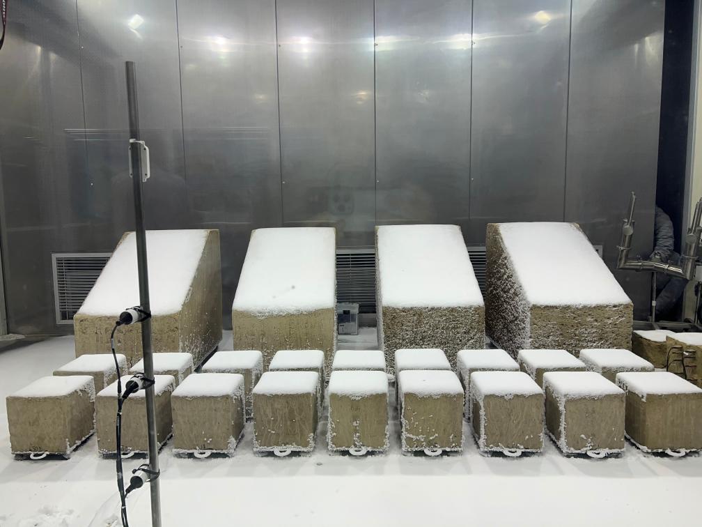 在國內(nèi)首個文物保護領(lǐng)域多場耦合實驗室,4塊覆蓋著厚厚冰雪的土方吸引了記者們的注意。雨雪風(fēng)霜是實驗室的模擬對象,從莫高窟等地取來的土石將經(jīng)受各種氣象條件,以揭示石窟寺風(fēng)化的奧秘。
