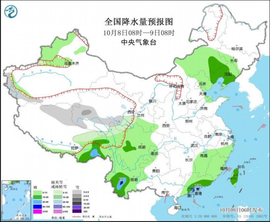 圖1 全國(guó)降水量預(yù)報(bào)圖(10月8日08時(shí)-9日08時(shí))