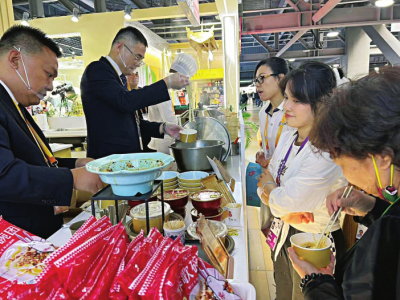 進博會山西展廳現(xiàn)場,汾酒、老陳醋、鐵壺、瓷器等老字號產品抓人眼球之外,展廳中心位置的山西美食專區(qū)尤其受大眾歡迎。