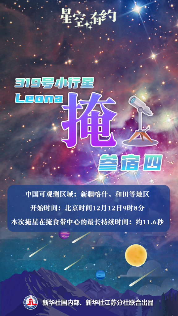 新華社南京12月10日電(記者邱冰清、秦華江)中國科學院紫金山天文臺科普主管王科超介紹,北京時間12月12日,319號小行星Leona將掩恒星參宿四。最早能看到本次掩星過程的是中國新疆喀什、和田等地區(qū),開始時間是當日9時8分。本次掩星在掩食帶中心的最長持續(xù)時間約為11.6秒。