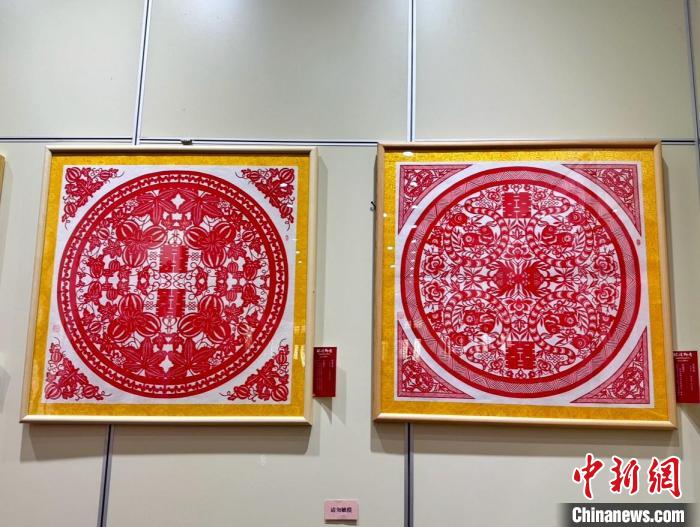 現(xiàn)場展出的盤合作品和《婚俗服飾》系列剪紙作品。楊靜攝