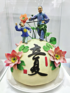 展覽的中心位置陳列著一件名為“龍騰盛世”的巨型霍州花饃作品,這件約2.5米高的作品,以中華龍為主題,象征著民族的繁榮與昌盛,是本次展覽中最大的一件作品。該作品與現(xiàn)場(chǎng)年饃、喜饃、壽饃、禮饃等4組作品代表霍州花饃的巔峰之作。