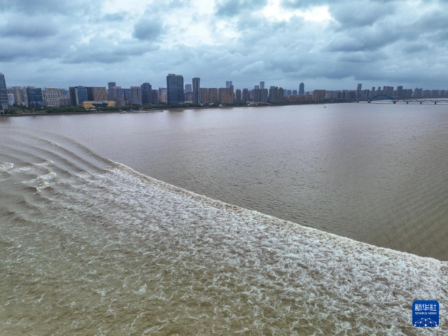 2024年9月19日拍攝的錢塘江潮水(無人機(jī)照片)。每年中秋節(jié)前后是錢塘江潮水的最佳觀賞期,被譽(yù)為“八月十八潮 壯觀天下無”。(圖片來源:新華社記者 江漢 攝)