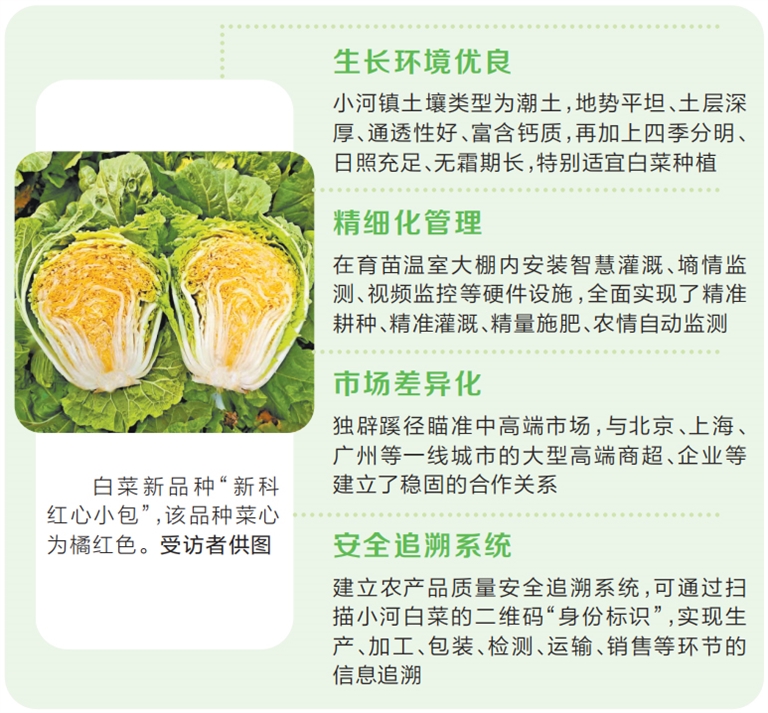 “小河白菜跳出‘白菜價’,我們最大的底氣便是好的品種培育。”綠源農(nóng)牧總經(jīng)理張躍民介紹,他從2008年開始流轉(zhuǎn)600余畝土地規(guī)模化種植小河白菜,品種大部分來自新鄉(xiāng)市農(nóng)科院蔬菜研究團隊。往年該公司主要種植的白菜品種為“新科小包26”,一棵也能賣到39元。