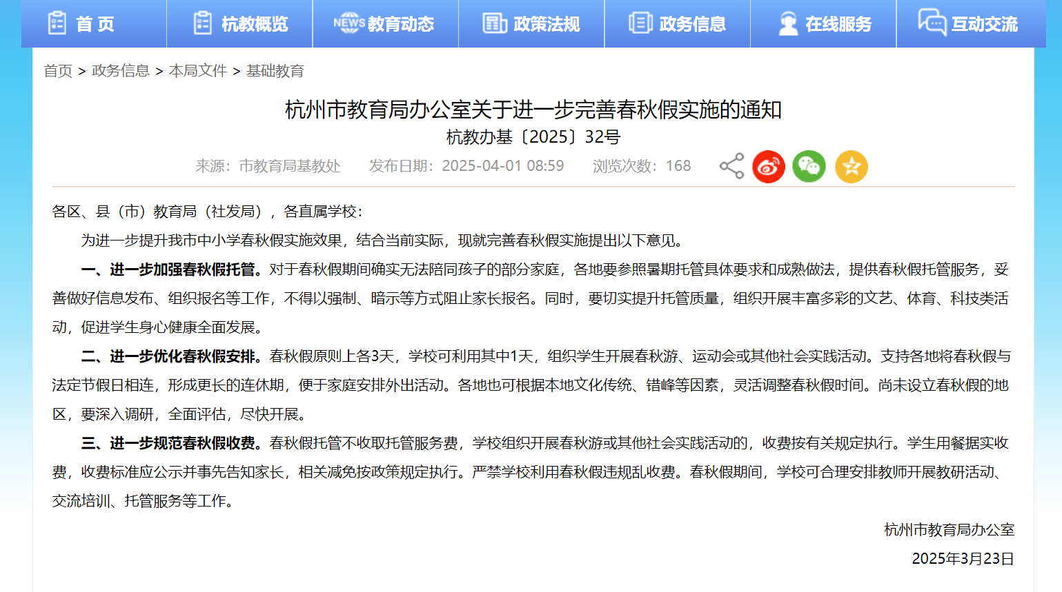 ▲杭州市教育局明確要求春秋假托管不收取托管服務(wù)費(fèi)