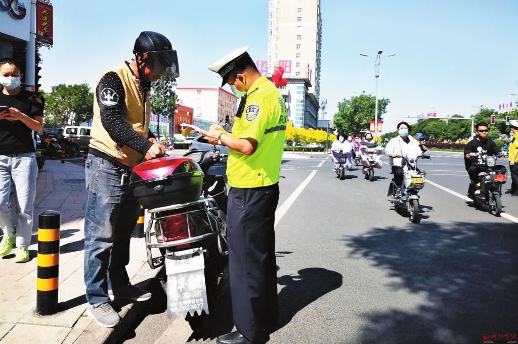 個別市民為了搶幾十秒時間,少走幾百米路,騎電動車闖紅燈、逆行,結(jié)果收到交警的罰單。5月27日,在城區(qū)建設(shè)路與長征街路口,執(zhí)勤交警一邊開罰單,一邊苦口婆心地勸說交通違法者:“為了自己和他人的安全,一定要遵守交通法規(guī),摒棄交通陋習(xí),遠離交通事故。”(記者 張劍雄 攝)