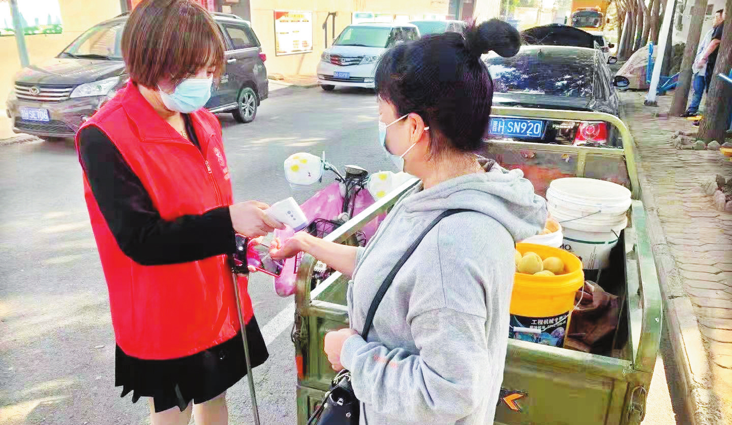 忻府區(qū)南街村新時(shí)代文明實(shí)踐站的志愿者在橋西街巷為居民測(cè)體溫。 許寧寧 攝