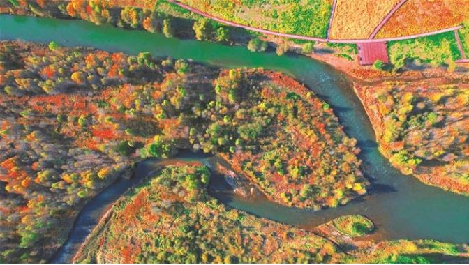 10月14日,航拍鏡頭下的靜樂汾河川國家濕地公園,秋意濃濃,景美如畫。 本報記者 張存良攝