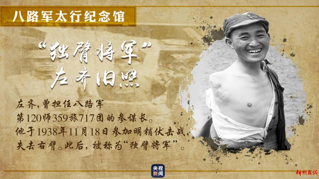 一張獨(dú)臂將軍的舊照,展現(xiàn)出八路軍為爭(zhēng)取民族獨(dú)立,不怕?tīng)奚?、不畏艱險(xiǎn)的革命英雄主義精神。