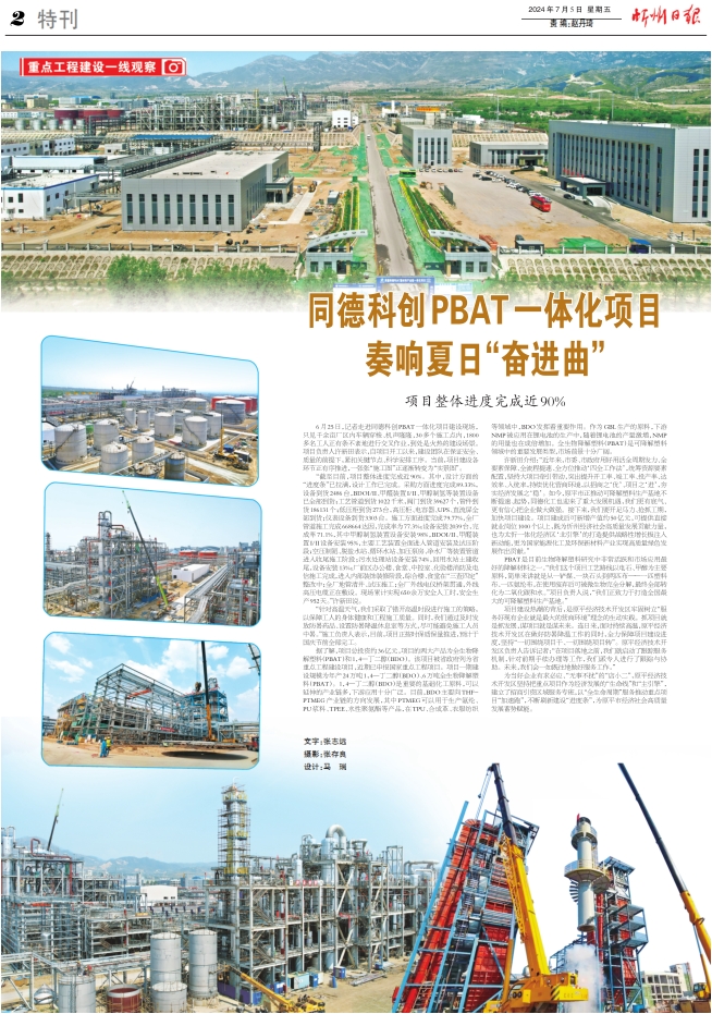 6月25日,記者走進同德科創(chuàng)PBAT一體化項目建設(shè)現(xiàn)場,只見千余畝廠區(qū)內(nèi)車輛穿梭、機聲隆隆,30多個施工點內(nèi),1800多名工人正有條不紊地進行交叉作業(yè),到處是火熱的建設(shè)場景。項目負責(zé)人許新田表示,自項目開工以來,建設(shè)團隊在保證安全、質(zhì)量的前提下,緊扣關(guān)鍵節(jié)點、科學(xué)安排工序。當前,項目建設(shè)各環(huán)節(jié)正有序推進,一張張“施工圖”正逐漸轉(zhuǎn)變?yōu)椤皩嵕皥D”。