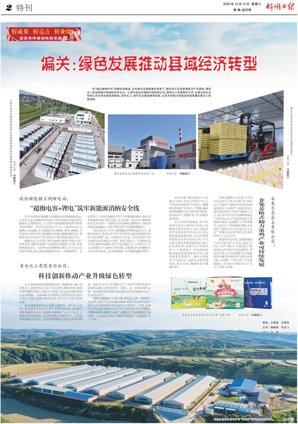 在“碳達峰碳中和”戰(zhàn)略縱深推進、鄉(xiāng)村振興全面提速的背景下,偏關(guān)縣立足資源稟賦與產(chǎn)業(yè)基礎(chǔ),涌現(xiàn)出一批深耕細分領(lǐng)域的標桿企業(yè)。山西中電金谷儲能科技有限公司、晉電化工有限責(zé)任公司、永奧生態(tài)農(nóng)業(yè)有限公司分別在新能源儲能、綠色化工、現(xiàn)代農(nóng)業(yè)賽道破局創(chuàng)新,以技術(shù)突破為縣域經(jīng)濟高質(zhì)量發(fā)展注入強勁動能。