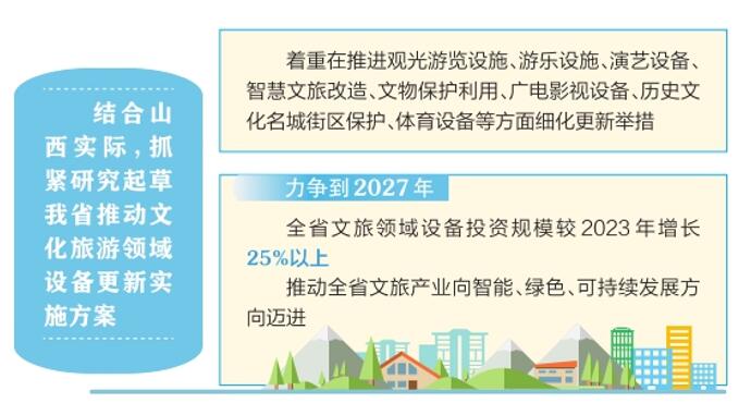 系統(tǒng)推進,夯實重點任務。結合山西實際,抓緊研究起草我省推動文化旅游領域設備更新實施方案,著重在推進觀光游覽設施、游樂設施、演藝設備、智慧文旅改造、文物保護利用、廣電影視設備、歷史文化名城街區(qū)保護、體育設備等方面細化更新舉措,明確更新提升重點,力爭到2027年,全省文旅領域設備投資規(guī)模較2023年增長25%以上,推動全省文旅產(chǎn)業(yè)向智能、綠色、可持續(xù)發(fā)展方向邁進。