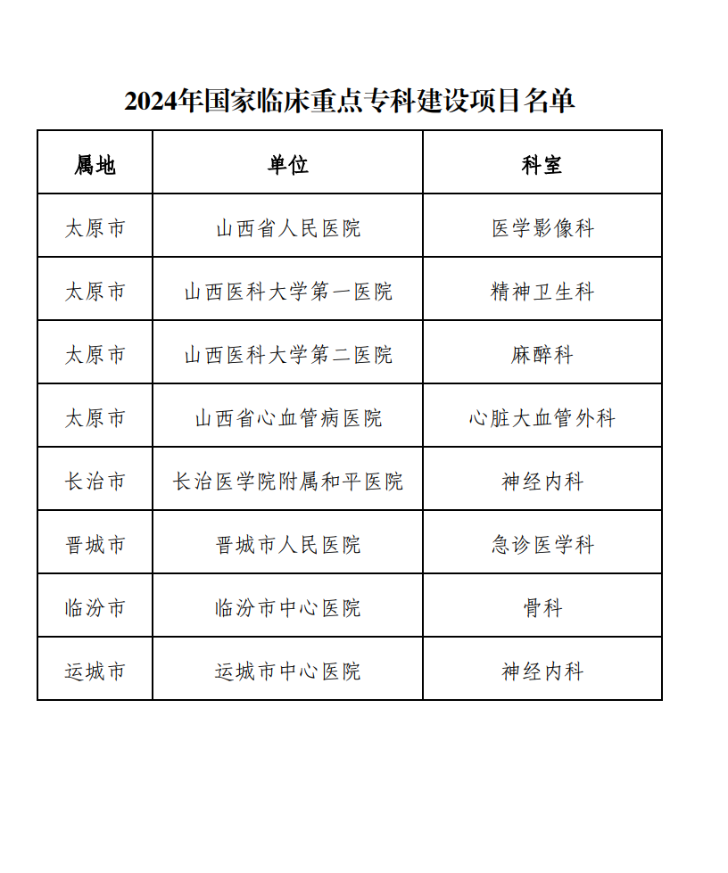 黃河新聞網(wǎng)訊(記者孫宇佳)日前,山西省衛(wèi)健委對擬確定為2024年國家臨床重點專科建設(shè)項目的醫(yī)院及??泼麊芜M(jìn)行了公示。據(jù)悉,本次名單根據(jù)《山西省衛(wèi)生健康委辦公室關(guān)于印發(fā)〈“十四五”期間山西省臨床重點專科建設(shè)實施方案〉的通知》和國家臨床重點??平ㄔO(shè)項目申報工作總體安排,在各市衛(wèi)生健康委和委直屬有關(guān)醫(yī)院積極申報后,經(jīng)山西省衛(wèi)生健康委組織省醫(yī)療服務(wù)評價中心和省級專家進(jìn)行評審后產(chǎn)生。