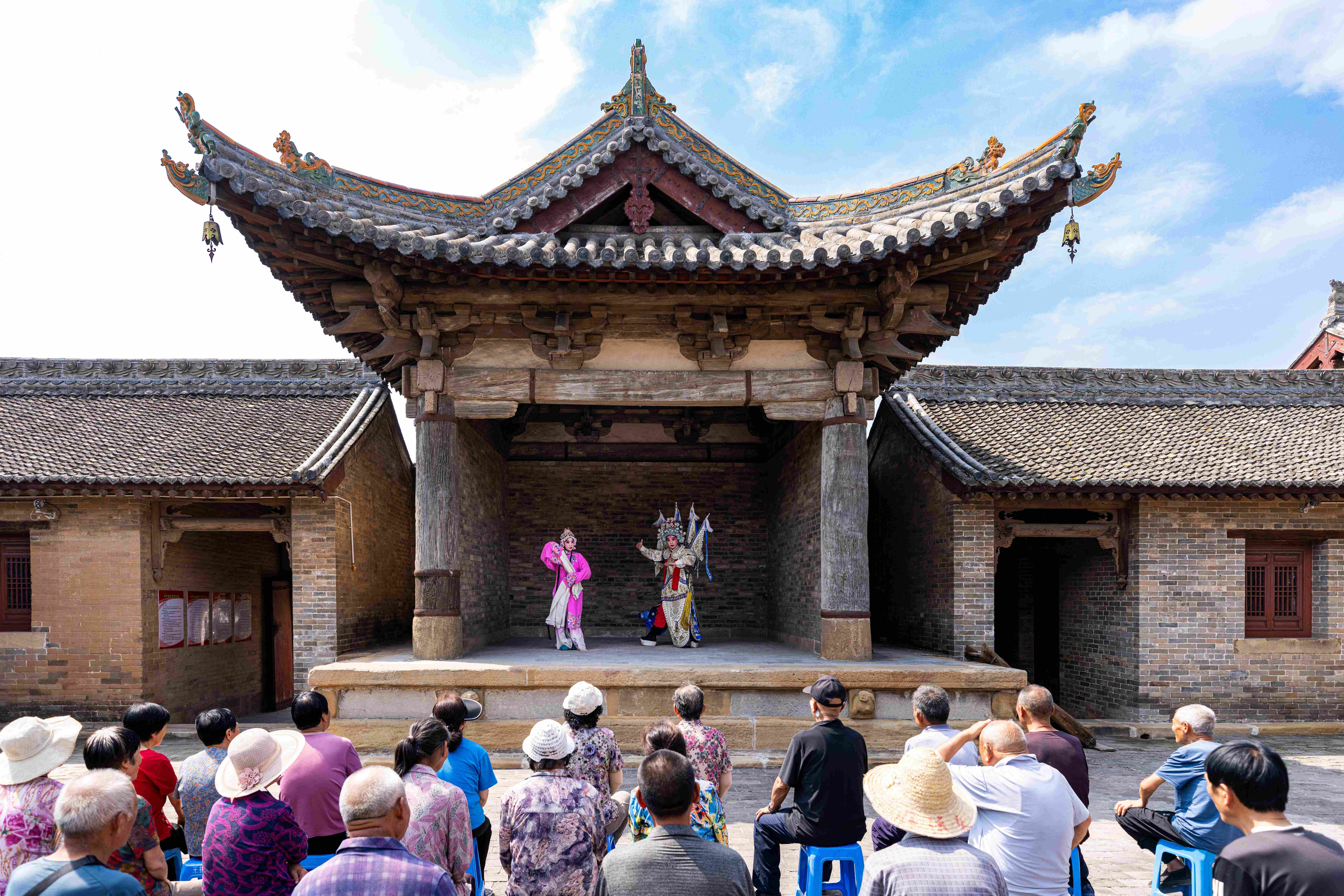 在高墻小院中、老舊的院房門口,演員不時(shí)穿梭演繹。蘇莊村是中國傳統(tǒng)村落,幾百年的四合院建筑成了沉浸式演出的天然舞臺(tái)。像這樣的村莊,在高平市這片古老的土地上,星羅棋布,如同一部史書,訴說著過往的輝煌與滄桑。