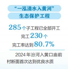 碧水保衛(wèi)戰(zhàn)鞏固提升。深入開(kāi)展黃河干流流經(jīng)縣生態(tài)環(huán)境綜合治理攻堅(jiān)行動(dòng),全面完成黃河流域入河排污口排查整治,全省3915個(gè)入河排污口納入平臺(tái)監(jiān)管。嚴(yán)格落實(shí)“四水四定”,建立全省管控指標(biāo)體系,強(qiáng)化水資源消耗總量和強(qiáng)度剛性約束,實(shí)施深度節(jié)水控水行動(dòng),萬(wàn)元工業(yè)增加值用水量較“十三五”末下降30.0%。開(kāi)展地下水超采綜合治理,全省地下水位整體回升2.51米,持續(xù)推進(jìn)全省19處巖溶大泉保護(hù)治理,斷流30年的晉祠泉2023年實(shí)現(xiàn)復(fù)流。全省地表水國(guó)考斷面優(yōu)良水體比例由“十三五”末的70.7%提升至2024年的94.7%,連續(xù)兩年超過(guò)國(guó)家平均水平,黃河干流(山西段)水質(zhì)連續(xù)三年穩(wěn)定達(dá)到Ⅱ類(lèi),汾河入黃口斷面2024年首次達(dá)Ⅲ類(lèi)優(yōu)良。