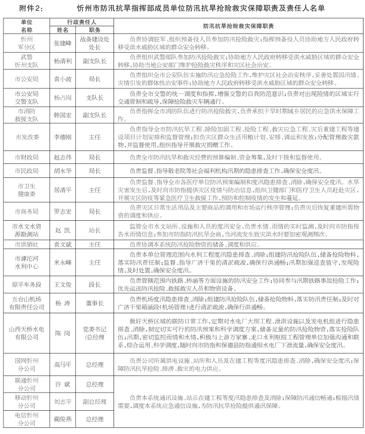 2.忻州市防汛抗旱指揮部成員單位防汛抗旱搶險救災保障職責及責任人名單