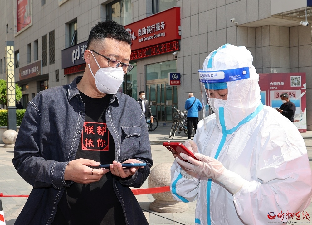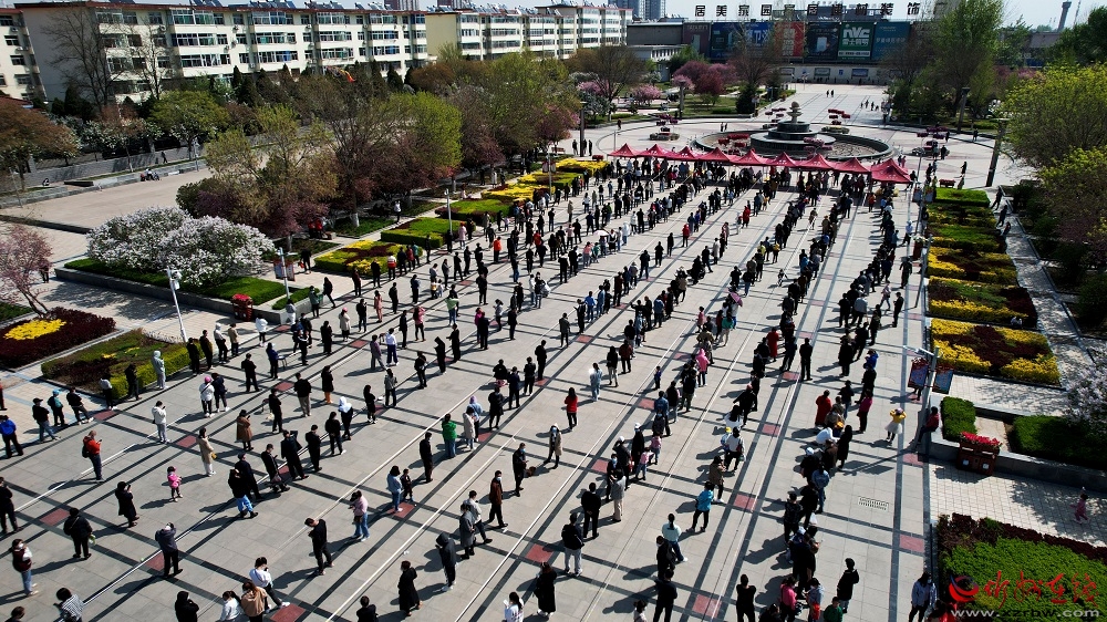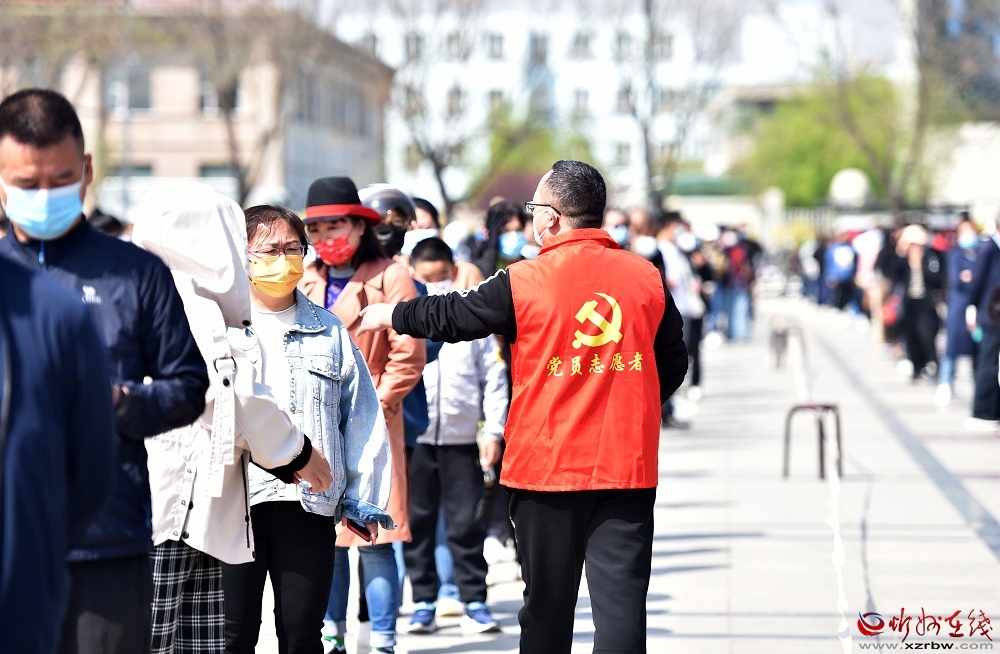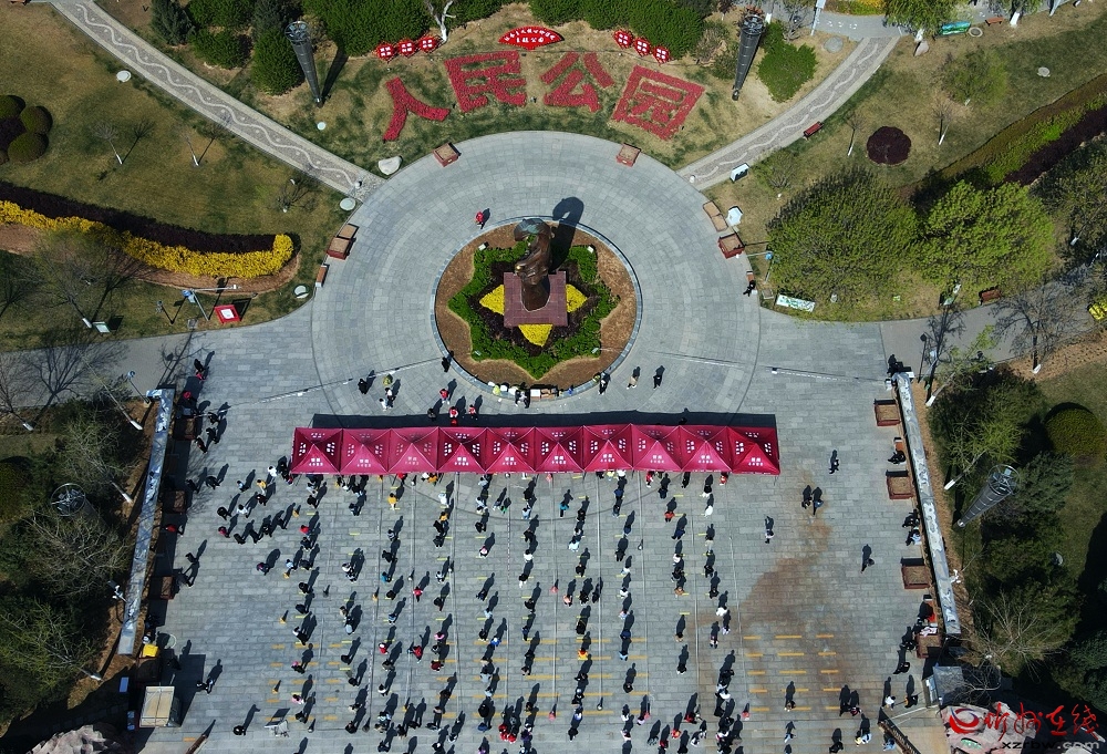 在和平廣場(chǎng)。馮曉磊 攝 “我們城南區(qū)域設(shè)置了6個(gè)核酸檢測(cè)點(diǎn),許多黨員志愿者主動(dòng)請(qǐng)纓、投身疫情防控一線,用實(shí)際行動(dòng)展現(xiàn)了黨員的責(zé)任和擔(dān)當(dāng)?!痹诩t旗廣場(chǎng)檢測(cè)點(diǎn),南城辦黨工委書記張斌拿著小喇叭,在隊(duì)伍中間來回穿梭,指揮志愿者引導(dǎo)市民分批次、分時(shí)段有序檢測(cè),防止人員扎堆聚集,避免交叉感染。