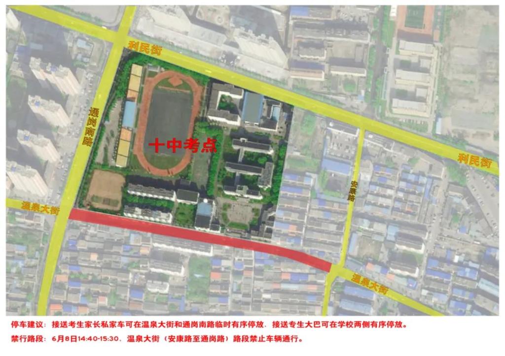 停車建議:接送考生家長(zhǎng)私家車可在溫泉大街和通崗南路臨時(shí)有序停放,接送考生大巴可在學(xué)校兩側(cè)有序停放。