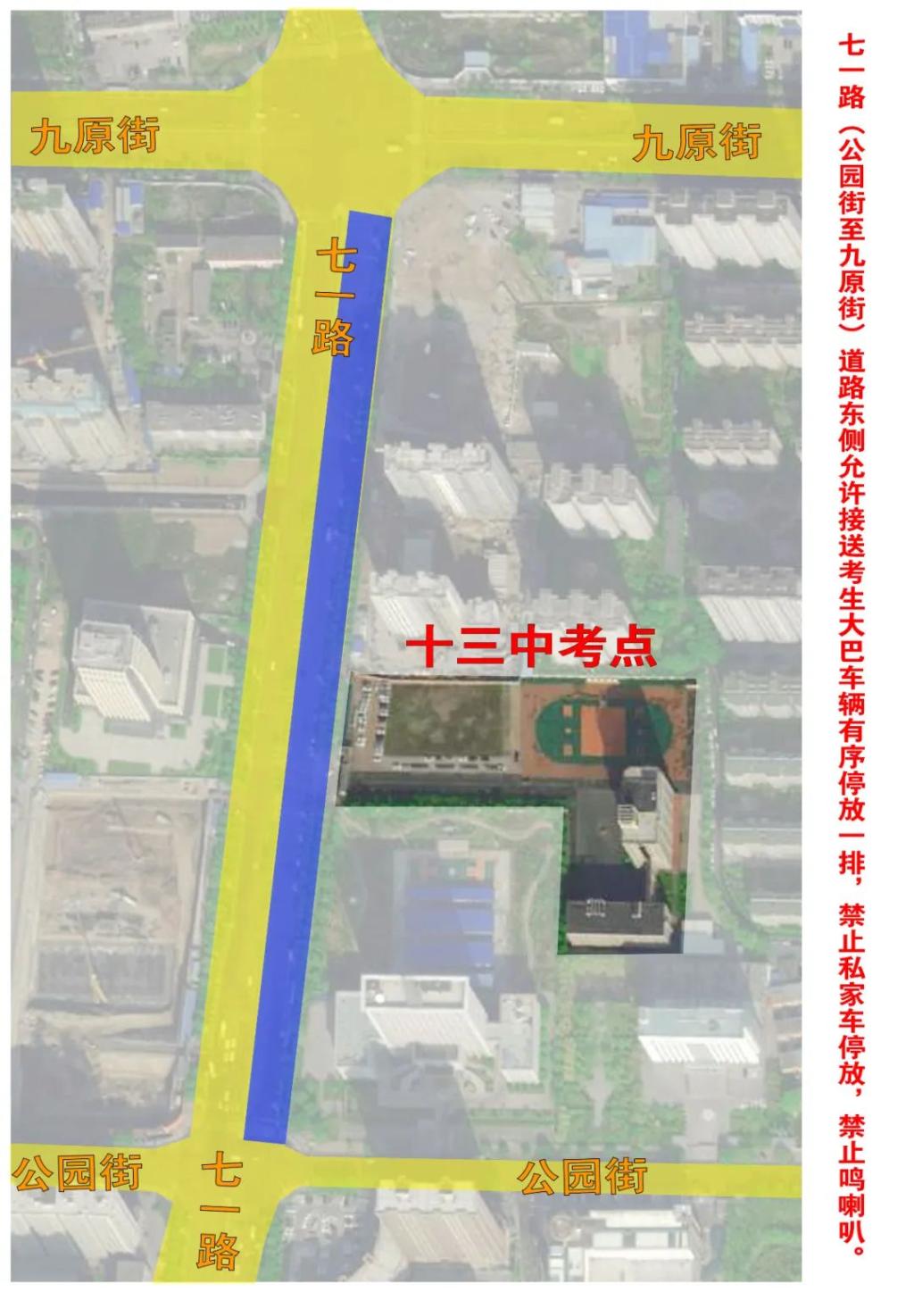 七一路(公園街至九原街)道路東側(cè)允許接送考生大巴車輛有序停放一排,禁止私家車停放,禁止鳴喇叭。