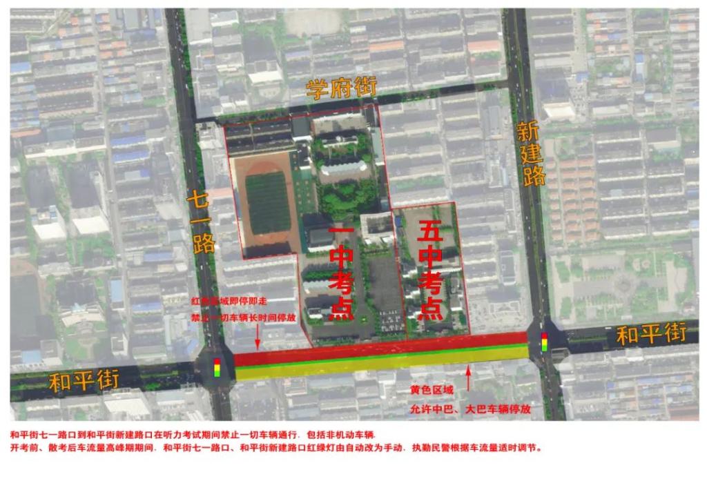 英語(yǔ)聽力考試期間,和平街(七一路至新建路)道路兩側(cè)封閉,實(shí)行交通管制,禁止一切車輛東西通行,禁止鳴喇叭。