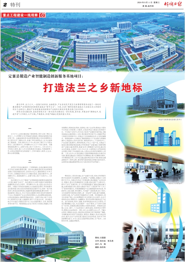 樊劍表示,項(xiàng)目的實(shí)施,在產(chǎn)業(yè)提升方面,將充分利用現(xiàn)代數(shù)字信息技術(shù)為設(shè)備賦智、企業(yè)賦值、產(chǎn)業(yè)賦能,創(chuàng)建法蘭交易數(shù)字化平臺,為制定發(fā)布法蘭價(jià)格指數(shù),推動鍛造產(chǎn)業(yè)向信息化、智能化、數(shù)字化發(fā)展提供有力支撐,進(jìn)而實(shí)現(xiàn)“產(chǎn)業(yè)數(shù)字化、數(shù)字產(chǎn)業(yè)化”發(fā)展目標(biāo),為“太忻數(shù)據(jù)流量谷”建設(shè)貢獻(xiàn)定襄力量;在服務(wù)提質(zhì)方面,將深入推進(jìn)開發(fā)區(qū)“三項(xiàng)改革”和“三無三可”營商環(huán)境優(yōu)化,實(shí)現(xiàn)圍繞鍛造產(chǎn)業(yè)全鏈條提供商務(wù)信息、科技研發(fā)、創(chuàng)業(yè)創(chuàng)新、轉(zhuǎn)化孵化、中試量產(chǎn)、檢驗(yàn)檢測、技工培訓(xùn)、文化創(chuàng)意等方面的綜合服務(wù),進(jìn)一步延伸產(chǎn)業(yè)鏈、提升創(chuàng)新鏈、完善供應(yīng)鏈,為產(chǎn)業(yè)轉(zhuǎn)型升級提供有力支撐。項(xiàng)目建成后,將為全縣每戶規(guī)上企業(yè)免費(fèi)提供1至2間獨(dú)立辦公場所,企業(yè)可將商務(wù)洽談、財(cái)稅辦公、金融服務(wù)、項(xiàng)目咨詢等功能部室遷于此處??h行政審批、稅務(wù)、金融、咨詢等機(jī)構(gòu)在此設(shè)立辦事處,開發(fā)區(qū)整體搬遷入駐,為企業(yè)提供“一站式”服務(wù),以“辦事不出園區(qū)”為目標(biāo),因地制宜推動高頻公共服務(wù)進(jìn)園區(qū)。積極將全縣規(guī)上企業(yè)、銀行、三大運(yùn)營商引入服務(wù)基地,發(fā)揮帶動引領(lǐng)作用,降低企業(yè)運(yùn)營成本。同時(shí),深入企業(yè)傾聽企業(yè)心聲、了解企業(yè)需求、掌握企業(yè)動態(tài),制定相應(yīng)的招商引資方案和推廣策略,不間斷地舉辦各類產(chǎn)品促進(jìn)會、展覽會、觀摩會、技術(shù)交流會等活動,提升企業(yè)產(chǎn)品知名度,提高企業(yè)經(jīng)濟(jì)效益、技術(shù)水平和創(chuàng)新孵化能力,并為入駐企業(yè)提供物業(yè)管理、生產(chǎn)技術(shù)、工商財(cái)務(wù)申報(bào)、金融法律服務(wù)。