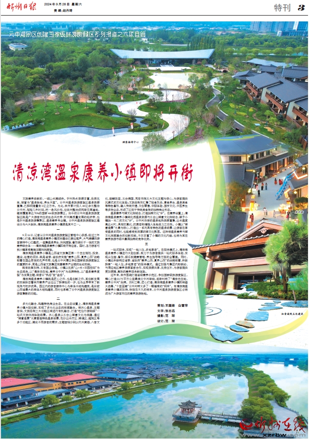 文旅康養(yǎng)添新彩,一城山水滿(mǎn)城詩(shī)。忻州熱水資源豐富、品質(zhì)優(yōu)良,被譽(yù)為“溫泉?jiǎng)俚亍B(yǎng)生天堂”。云中河溫泉旅游度假區(qū)溫泉資源富集,已探明儲(chǔ)量有2億立方米。為此,我市累計(jì)投入48億余元整治云中河,短短幾年時(shí)間,把一條風(fēng)沙溝、垃圾河整治成兩岸花草遍地、植被覆蓋率達(dá)70%的國(guó)家4A級(jí)旅游景區(qū)。如今的云中河溫泉旅游度假區(qū)既是廣大游客向往的生態(tài)風(fēng)光帶、忻州高質(zhì)量發(fā)展的經(jīng)濟(jì)帶,也是忻州溫泉旅游集聚區(qū)、溫泉康養(yǎng)專(zhuān)業(yè)鎮(zhèn)。云中河溫泉旅游度假區(qū)建設(shè)分為六大板塊,清涼灣溫泉康養(yǎng)小鎮(zhèn)便是其中之一。