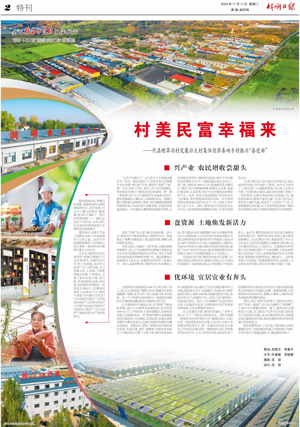 “只有產(chǎn)業(yè)振興了,人們的日子才能越過越紅火?!痹谶@一理念的指引下,村黨支部書記張繼平充分發(fā)揮“領(lǐng)頭雁”作用,調(diào)動村“兩委”干部、第一書記、駐村工作隊、到村工作大學(xué)生積極性,科學(xué)制定發(fā)展壯大集體經(jīng)濟(jì)總體規(guī)劃。第一期工程投資1277萬元實施現(xiàn)代化設(shè)施農(nóng)業(yè)項目,建設(shè)智能溫室大棚6座,占地面積52畝。玻璃大棚主要種植優(yōu)質(zhì)桃樹、棗樹,間作矮棵耐寒蔬菜和耐陰作物,并適時進(jìn)行金蟬養(yǎng)殖,實現(xiàn)經(jīng)濟(jì)效益的疊加。日光溫室大棚種植高端甜寶草莓,立體種植各類花卉,增加綜合收益,每年可為村集體經(jīng)濟(jì)增收30萬元,可提供就業(yè)崗位30余個。第二期工程投資1000萬元打造智能韭菜大棚項目,建設(shè)7座大型棉被拱棚,種植長白韭菜、高端紅根韭菜、漢韭菜等,預(yù)計可為村集體經(jīng)濟(jì)增收20萬元。此外,村黨支部還積極引導(dǎo)民營企業(yè)與村集體、農(nóng)民等結(jié)成利益共同體。村內(nèi)的潤明餅業(yè)提供就業(yè)崗位50余個,務(wù)工村民人均年收入達(dá)3萬元。同時,橙草溝村巨發(fā)農(nóng)機專業(yè)合作社示范種植韓國辣椒新品種,打造代縣特色試點。