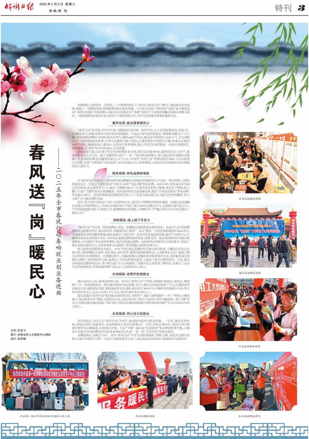 春潮涌動,萬物競發(fā)。在黨的二十大精神的指引下,我市以“春風(fēng)行動”為抓手,錨定就業(yè)優(yōu)先戰(zhàn)略,掀起了一場覆蓋全域、精準(zhǔn)施策的就業(yè)服務(wù)熱潮。從代縣文昌祠廣場的崗位“盛宴”到五寨縣迎賓廣場的鄉(xiāng)村振興專場招聘,從偏關(guān)縣太虎坡文化廣場的“龍?zhí)ь^”古會到易地搬遷安置點的暖心服務(wù),一場場招聘會如春風(fēng)化雨,潤澤萬千求職者的心田,為忻州高質(zhì)量發(fā)展增添蓬勃生機。