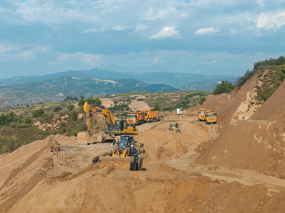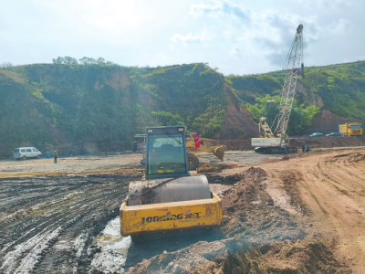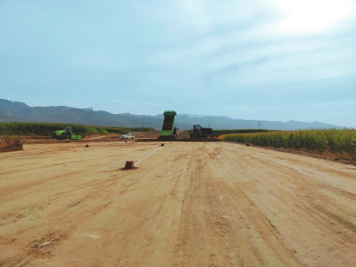 國(guó)道241線寧武縣城過境公路改線工程路基強(qiáng)夯現(xiàn)場(chǎng)。
