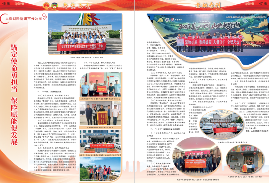 中國人民財產(chǎn)保險股份有限公司忻州市分公司(以下簡稱“人保財險忻州市分公司”)以習(xí)近平新時代中國特色社會主義思想為指導(dǎo),全面貫徹落實黨的二十大和二十屆歷次全會精神,深入學(xué)習(xí)貫徹習(xí)近平總書記對山西工作的重要講話及重要指示精神,緊緊圍繞忻州市委、市政府中心工作部署,錨定高質(zhì)量發(fā)展首要任務(wù),堅持穩(wěn)中求進工作總基調(diào),主動服務(wù)和融入新發(fā)展格局,在服務(wù)實體經(jīng)濟、助力鄉(xiāng)村振興、保障民生福祉等方面主動擔(dān)當(dāng)、積極作為,為全市經(jīng)濟社會發(fā)展提供堅實有力的保險支撐。