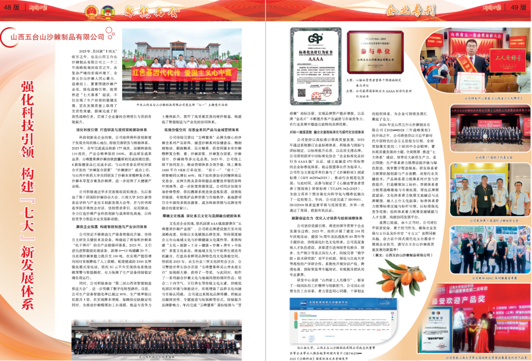 2025年,是國家“十四五”收官之年,也是山西五臺山沙棘制品有限公司上一個三年戰(zhàn)略規(guī)劃的收官之年。在復(fù)雜嚴(yán)峻的宏觀環(huán)境下,全體五臺山沙棘人同心聚力、迎難而上,緊緊圍繞沙棘產(chǎn)業(yè)化,強化戰(zhàn)略引領(lǐng),統(tǒng)籌推進“七大體系”建設(shè),不僅實現(xiàn)了生產(chǎn)經(jīng)營的穩(wěn)健發(fā)展,更在發(fā)展質(zhì)量上取得了實質(zhì)性突破,圓滿完成了階段性戰(zhàn)略任務(wù),實現(xiàn)了企業(yè)量的合理增長與質(zhì)的有效提升。