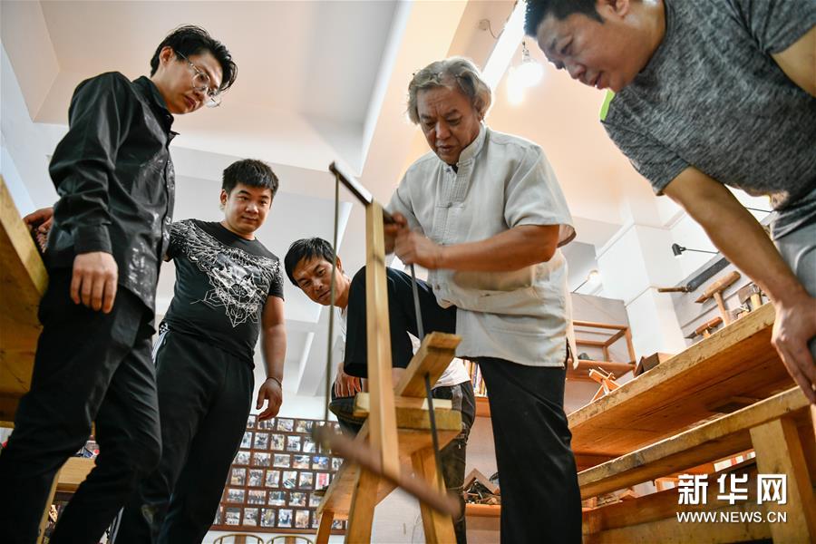 8月25日,在天津職業(yè)大學(xué)辛全生大師木藝工作室,辛全生(右二)給徒弟們演示開(kāi)料流程。新華社發(fā)(孫凡越 攝)