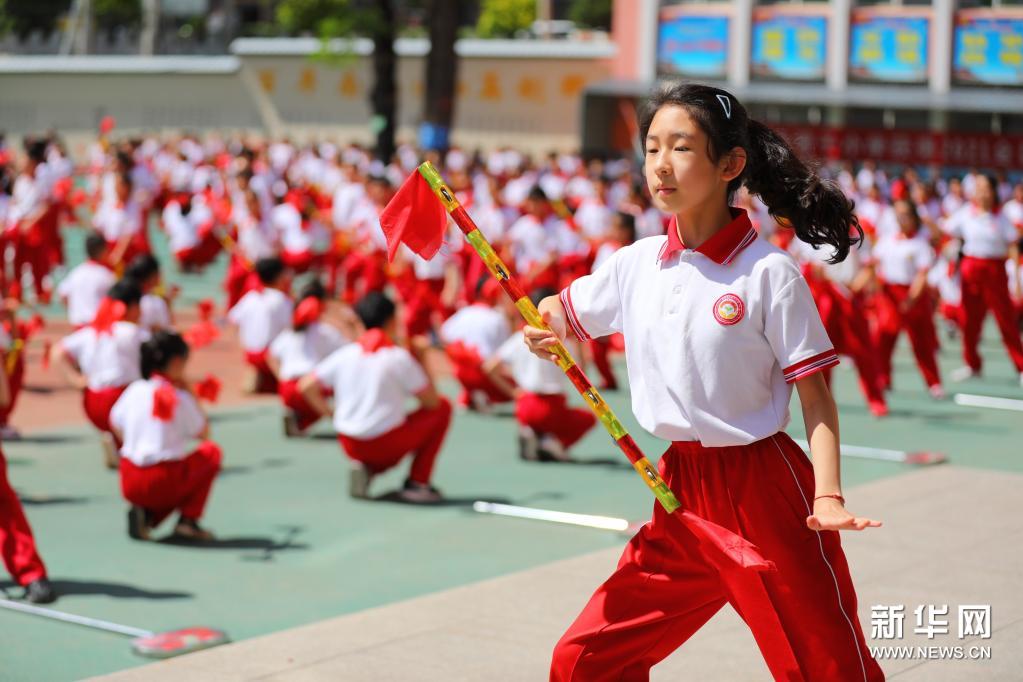 6月10日,在承德市雙橋區(qū)南營(yíng)子小學(xué),學(xué)生在大課間上練習(xí)“霸王鞭”。近年來(lái),河北省承德市雙橋區(qū)南營(yíng)子小學(xué)以開(kāi)展“陽(yáng)光大課間”為平臺(tái),將非遺民間舞蹈“霸王鞭”融入學(xué)校素質(zhì)教育實(shí)踐中,通過(guò)聘任專業(yè)老師,開(kāi)設(shè)“霸王鞭”體育運(yùn)動(dòng)社團(tuán),引導(dǎo)小學(xué)生在大課間上練習(xí)“霸王鞭”,增強(qiáng)體質(zhì),傳承非遺。新華社發(fā)(劉環(huán)宇 攝)