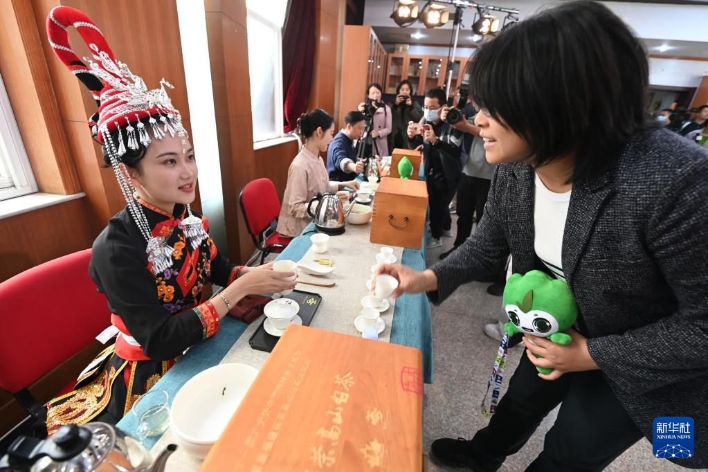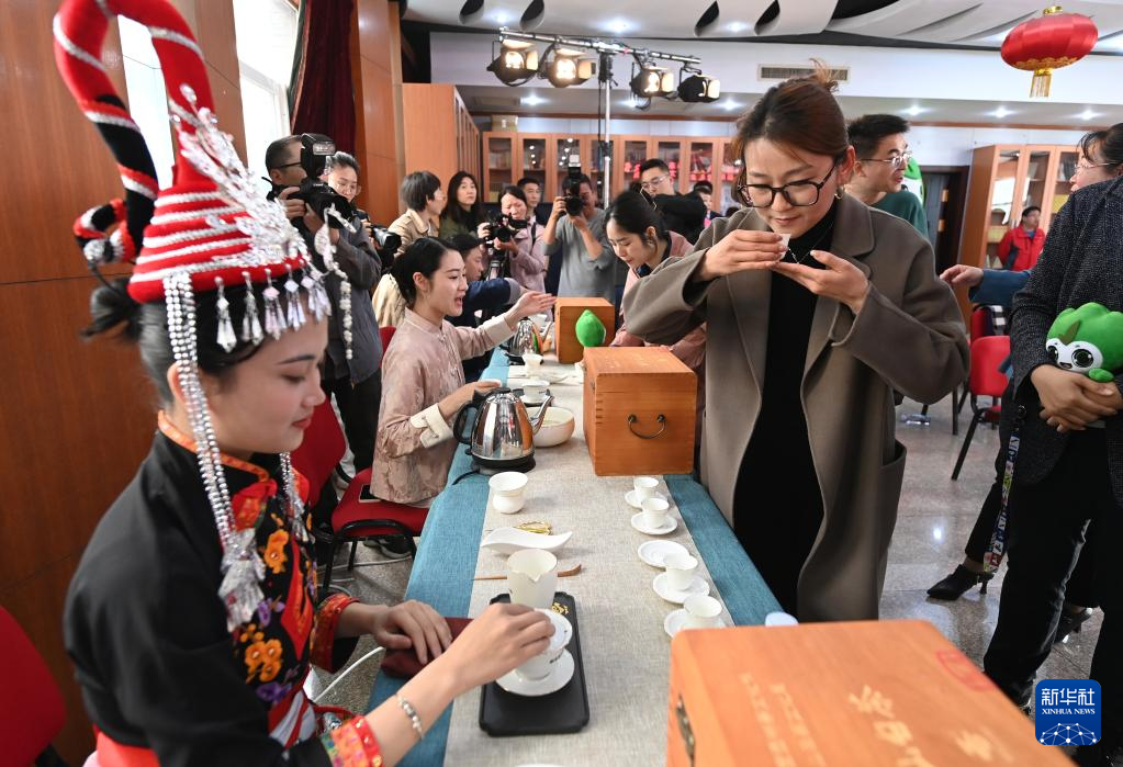 4月25日,媒體記者、與會嘉賓在茶文化節(jié)新聞發(fā)布會后品嘗、了解高山白茶。