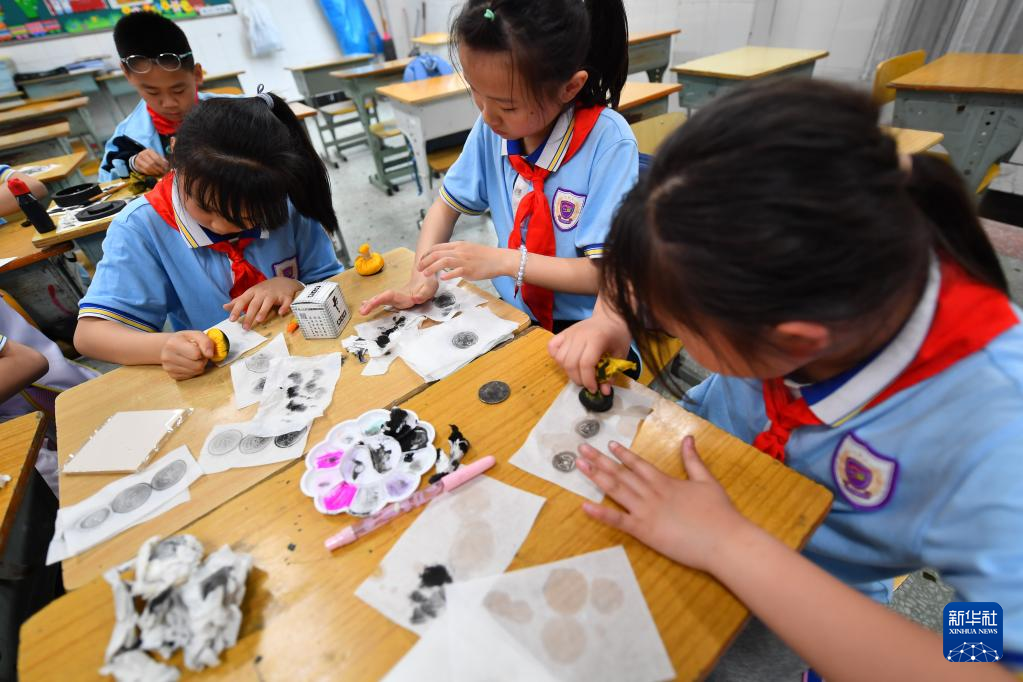 5月15日,在長(zhǎng)沙市天心區(qū)紅衛(wèi)小學(xué),學(xué)生在拓印課上體驗(yàn)拓印制作。