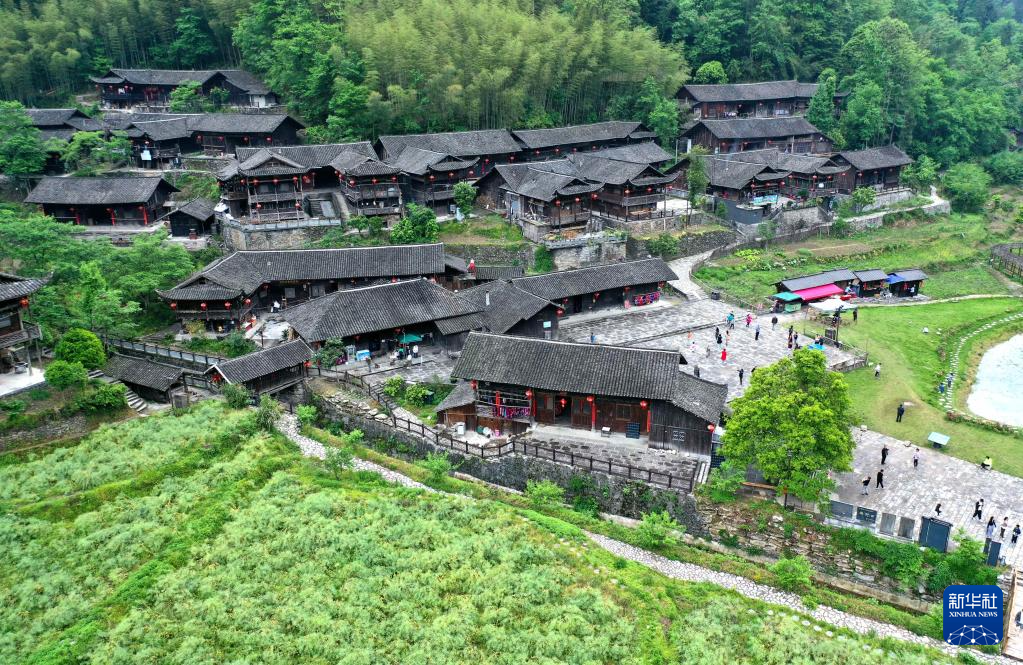 位于湖北省宣恩縣沙道溝鎮(zhèn)的彭家寨古吊腳樓群歷史悠久,吊腳樓保存完好,古樸雅致,是當(dāng)?shù)孛袼孜幕糜蔚臒衢T打卡地(5月2日攝,無人機(jī)照片)。