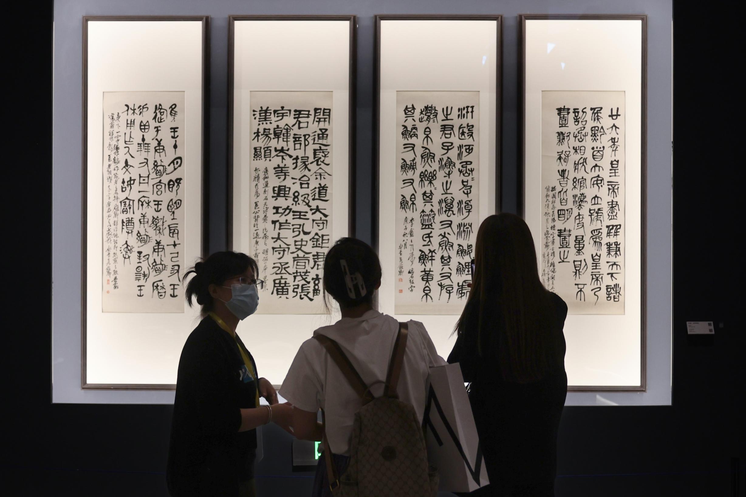 北京民生現(xiàn)代美術(shù)館副館長、民生書法藝術(shù)館副館長陳鴻毅介紹,該展緣起于中國民生銀行獨(dú)家贊助的大型系列人物傳記紀(jì)錄片《百年巨匠》。在策展過程中,展覽用中國傳統(tǒng)經(jīng)典名著《左傳》《論語》《史記》中的話語體系作為展覽的主框架,體現(xiàn)中華文明傳承之深遠(yuǎn),如“益者三友”部分展出了與松、竹、梅相關(guān)的作品,“白魚赤烏”部分則呈現(xiàn)了有關(guān)動(dòng)物與瑞獸的作品。