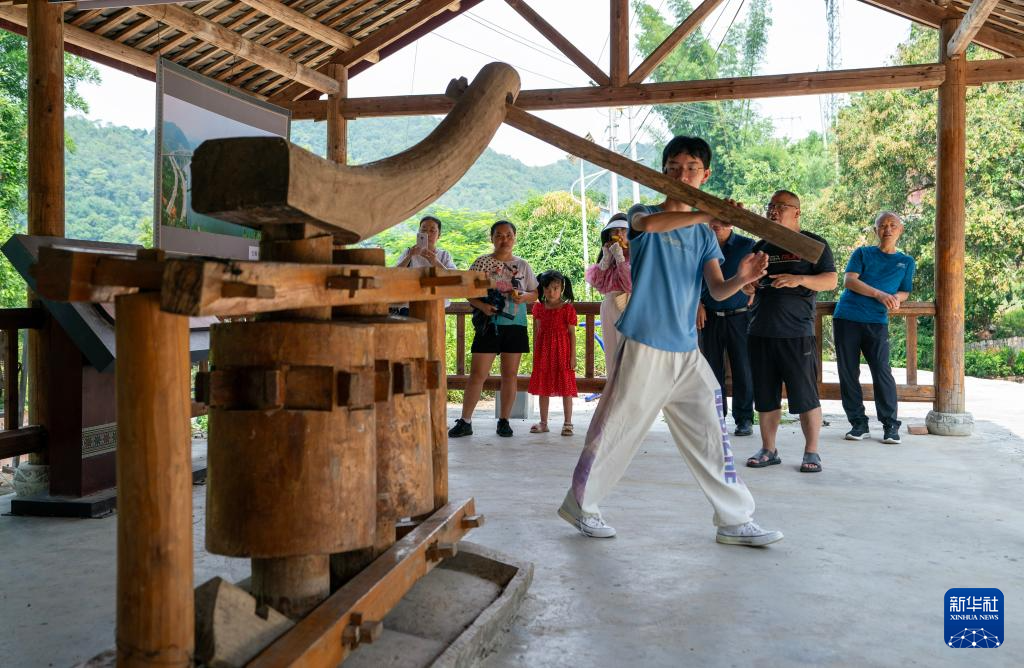 7月30日,一名游客在坡芽村內(nèi)體驗(yàn)壯族傳統(tǒng)的甘蔗榨汁機(jī)。