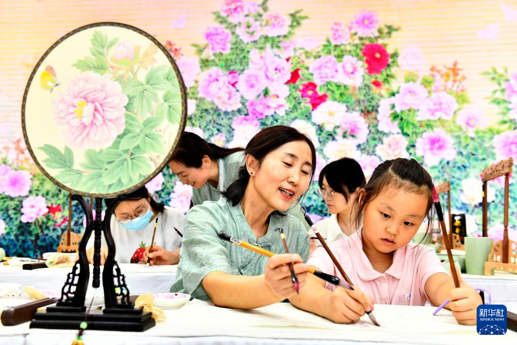 9月16日,在山東國際會展中心,來自巨野書畫院的藝術工作者姚愛紅教孩子給工筆牡丹畫上色。
