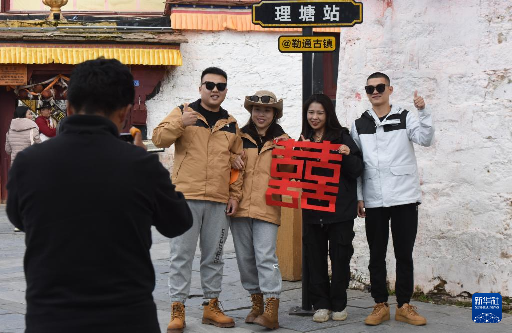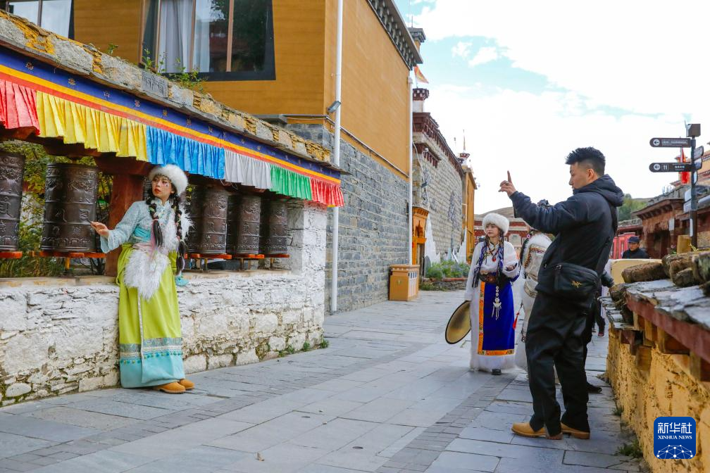 10月10日,游客在理塘縣勒通古鎮(zhèn)拍藏族風情寫真。