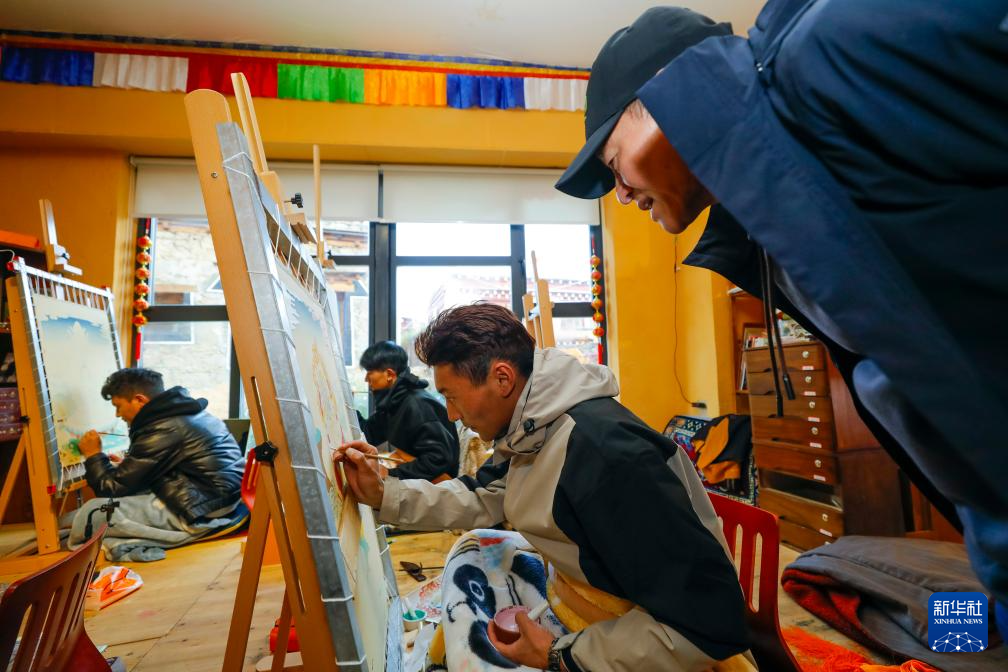 10月10日,游客(右)在理塘縣勒通古鎮(zhèn)的“唐卡館”觀看當?shù)厮囆g(shù)家創(chuàng)作唐卡作品。