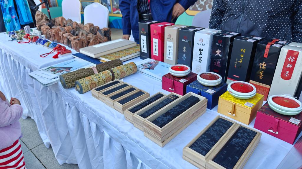 山東“秋季黃河大集”啟動(dòng)現(xiàn)場,文創(chuàng)企業(yè)展示具有特色的文房用品。新華社記者蕭海川攝