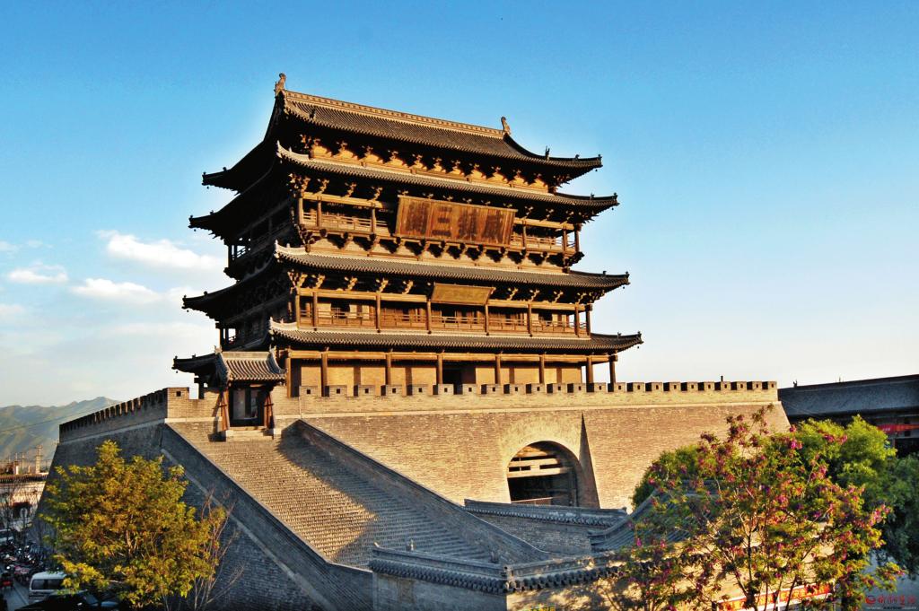 萬里長城第一樓——代縣古城邊靖樓。明洪武七年(1374年)始建,成化十二年(1476年)重建,由磚券洞臺基和三層四檐歇山頂樓身組成,基底東西長43.3米,南北寬33.3米,臺高13.3米。樓身高26.7米,總高度達(dá)到40米。樓身面闊7間29.65米,進(jìn)深5間19.30米。二層檐柱之上施五踩重翹斗拱,三層檐下施五踩重昂。每層四周呈上下重疊柱網(wǎng)布局,四周圍廊,別具特色。斗拱非常規(guī)整,梁架精致奇巧,建造恢宏威嚴(yán),是中國最大的木質(zhì)鼓樓,比山海關(guān)靖邊樓高15米,比嘉峪關(guān)城樓高17米,比天安門高5.3米,被長城專家考定為萬里長城第一樓。